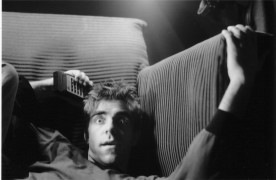 Sitting in an oversized armchair, a little boy watches T.V. in every imaginable position.
